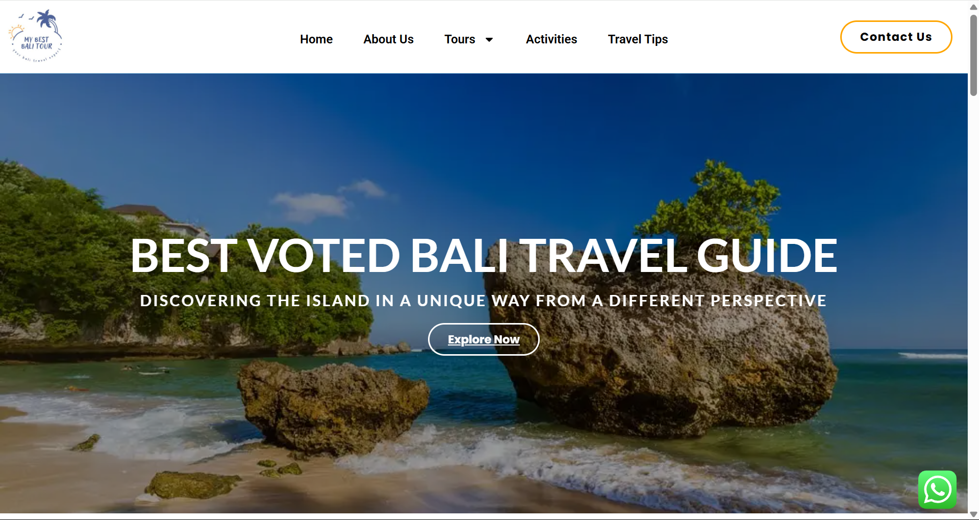 Company website for MyBest Bali Tour with tour packages, activities, WhatsApp booking, and responsive design.