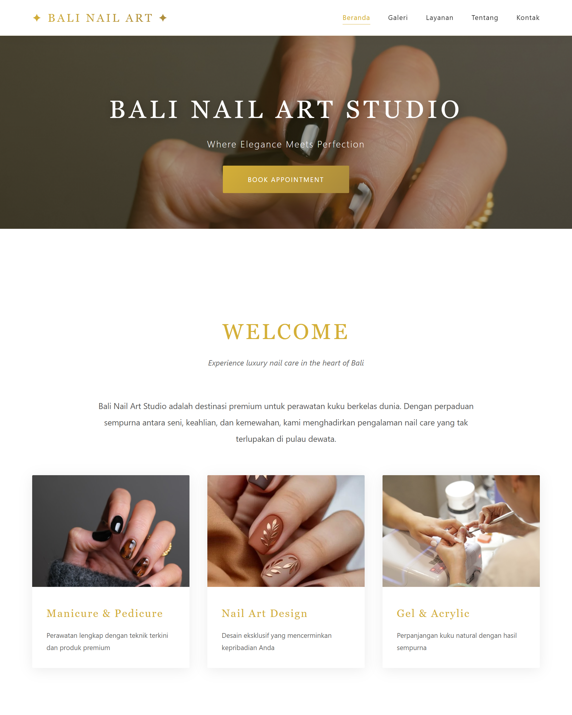 Website for Bali Nail Art showcasing nail art services, designs, pricing, and easy appointment booking.