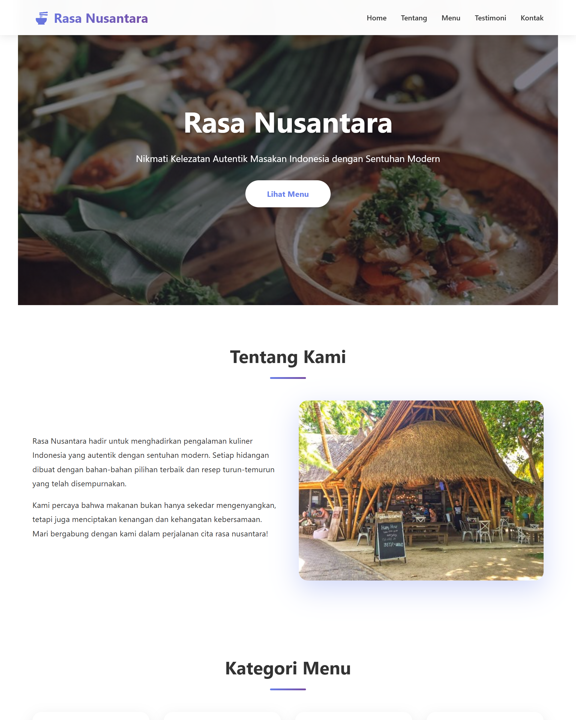 Website for Rasa Nusantara, an Indonesian restaurant showcasing traditional dishes, menu, and location.