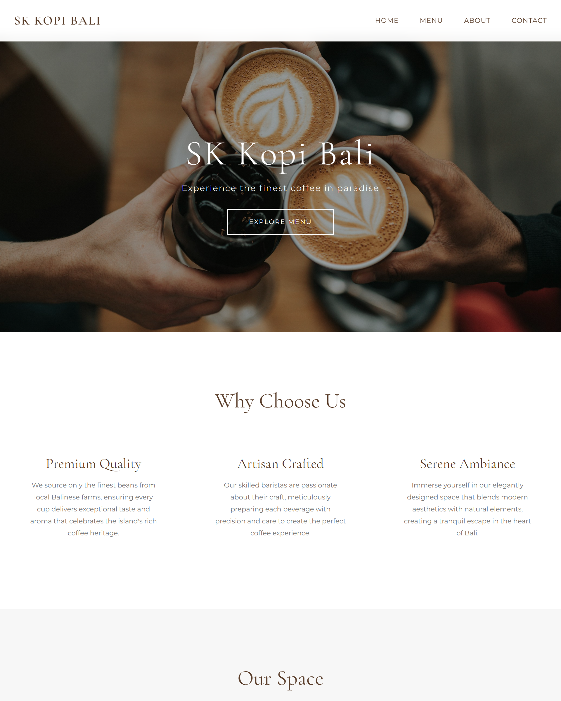 Website for SK Coffee Bali showcasing coffee products, café profile, menu, and contact information.